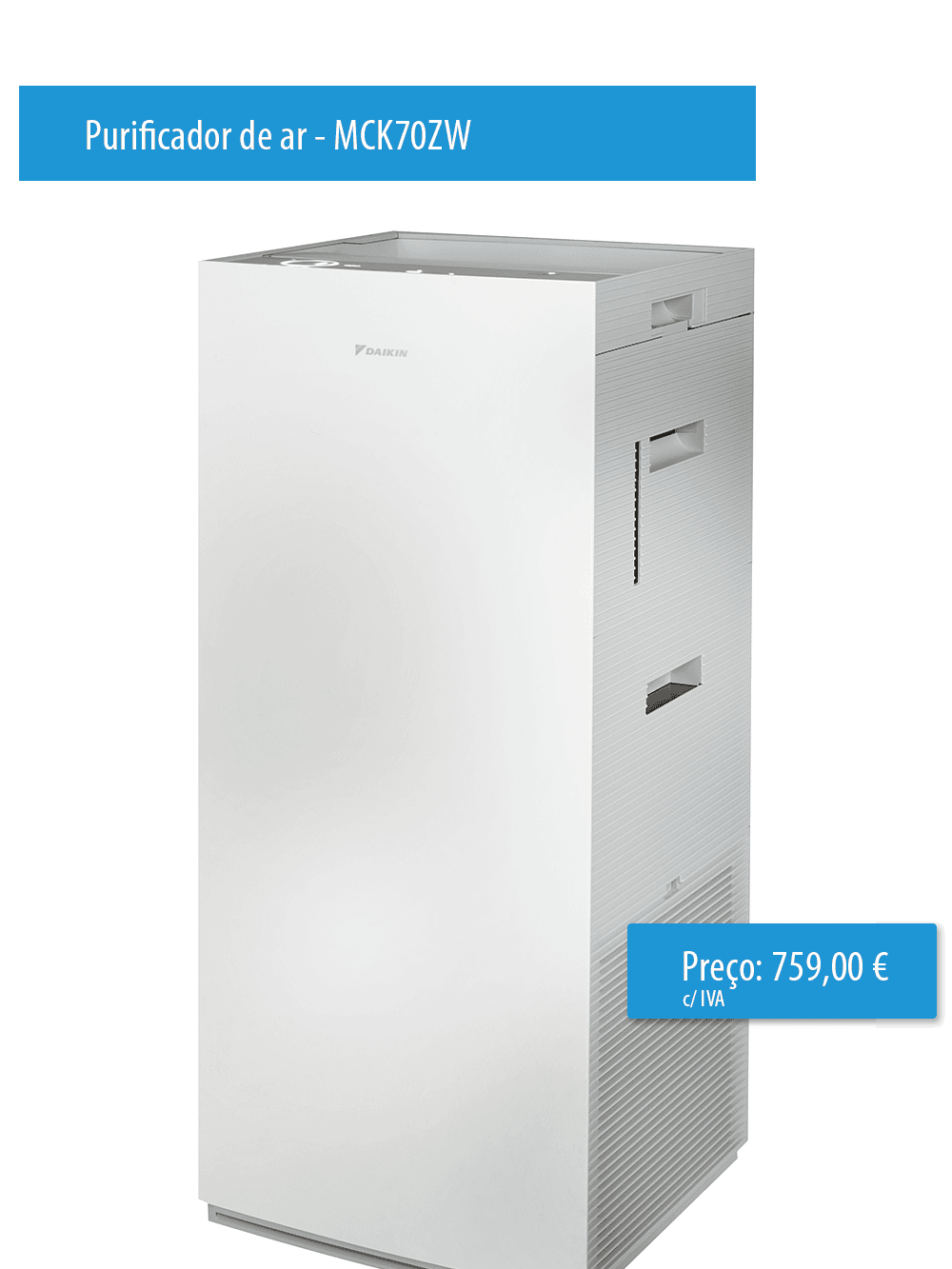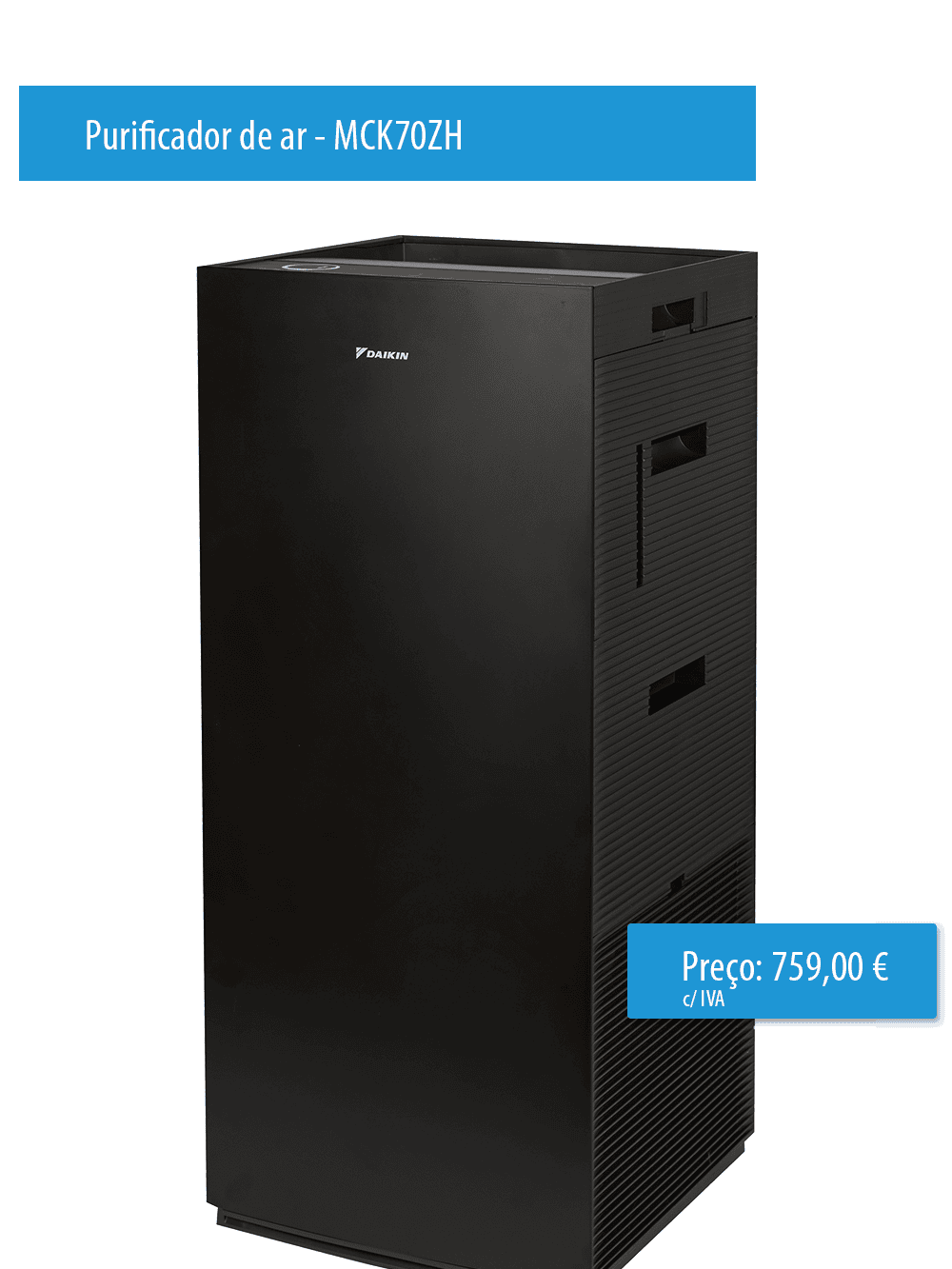 O sistema Daikin MCK70Z com Wi-Fi proporciona ar limpo e humidificado, purificando grandes espaços até 96 m²