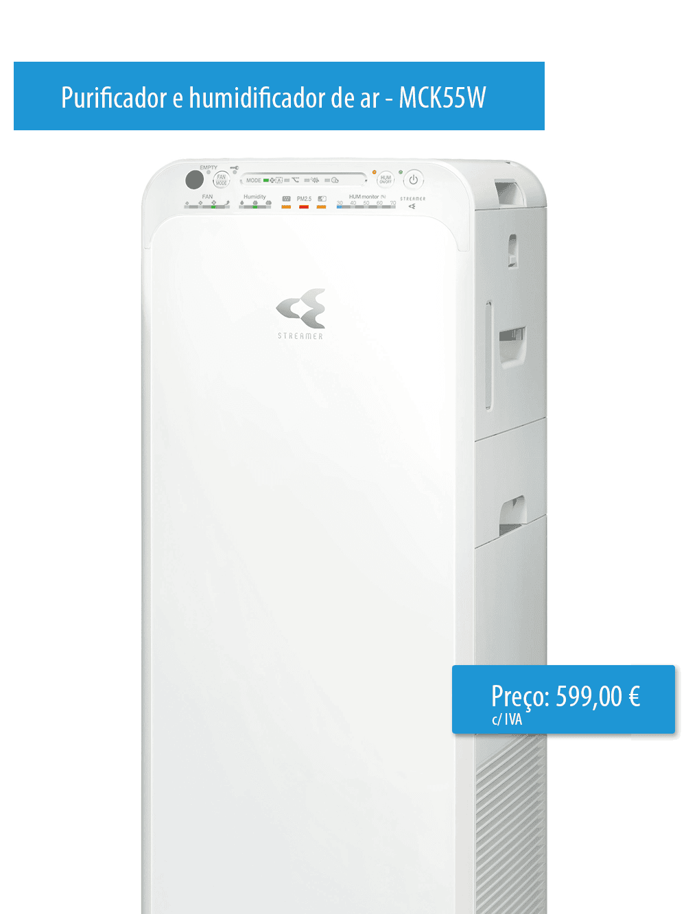 O purificador de ar Daikin Ururu purifica e humedece o ar dentro da sua casa. Basta encher ocasionalmente o depósito de 2,7 l e irá humidificar a divisão com um caudal máximo de 500 ml/h.