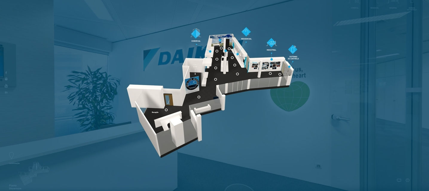 Explore as soluções Daikin, inspire-se em cenários 3D, veja exemplos de instalação e, caso possua óculos de Realidade Virtual, experiencie as unidades da Daikin em RV