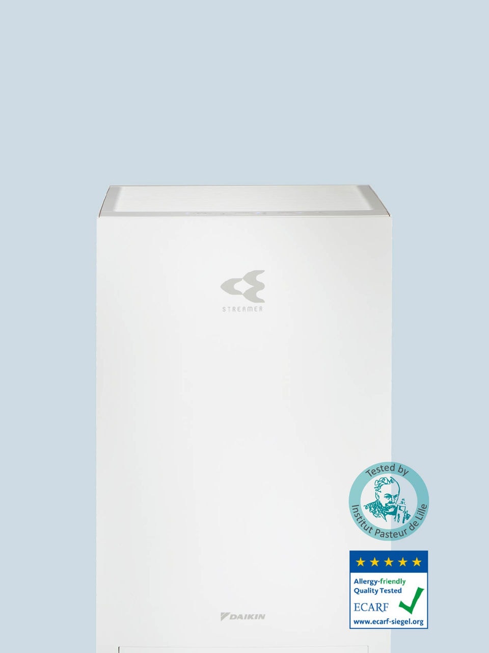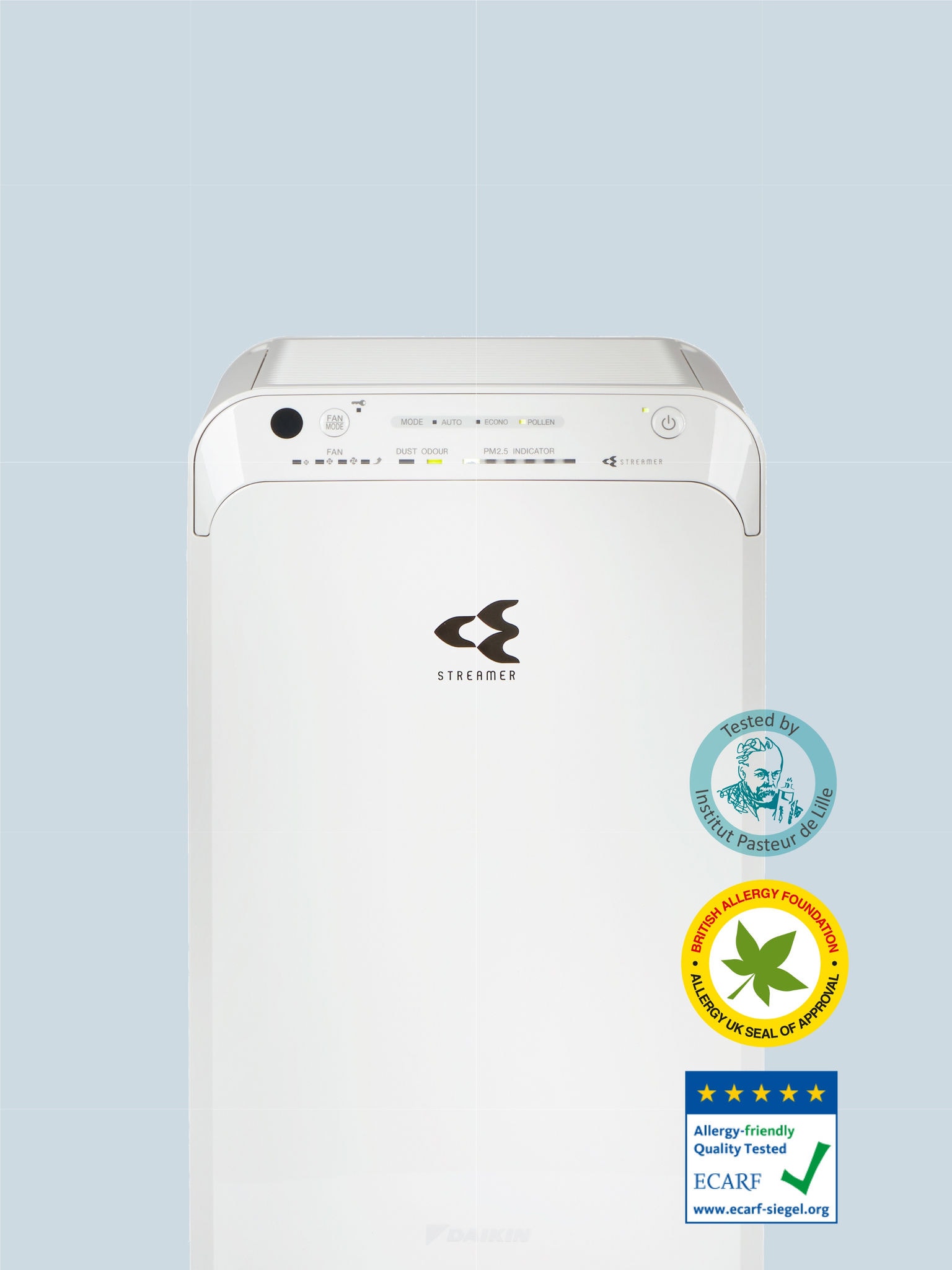 Ao investir num purificador de ar Daikin, há que assegurar que obtém os melhores resultados. É por isso que temos orgulho em dizer que os nossos produtos são testados por autoridades de prestígio, incluindo o Institut Pasteur de Lille, a British Allergy Foundation UK e o European Centre for Allergy Research Foundation (ECARF).